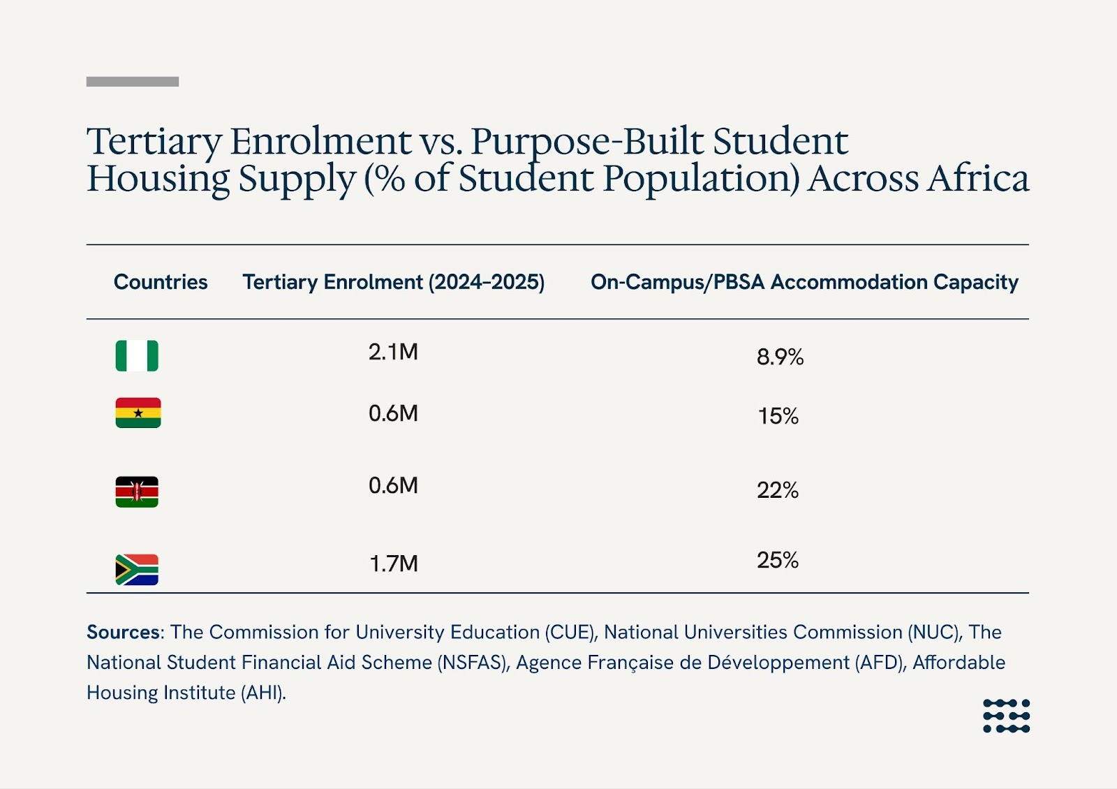 In Nigeria for instance, tertiary institutions are only able accommodate about 8.9% of their student population on average . In Kenya the average is about 22% , and major public universities in South Africa provide approximately one student bed for every 3.3 students, pushing the majority into a fragmented and often exploitative informal rental market within and outside campuses.